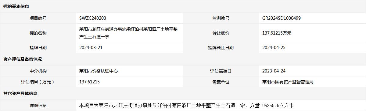 萊陽市龍旺莊街道辦事處梁好泊村萊陽酒廠土地平整產(chǎn)生土石渣一宗